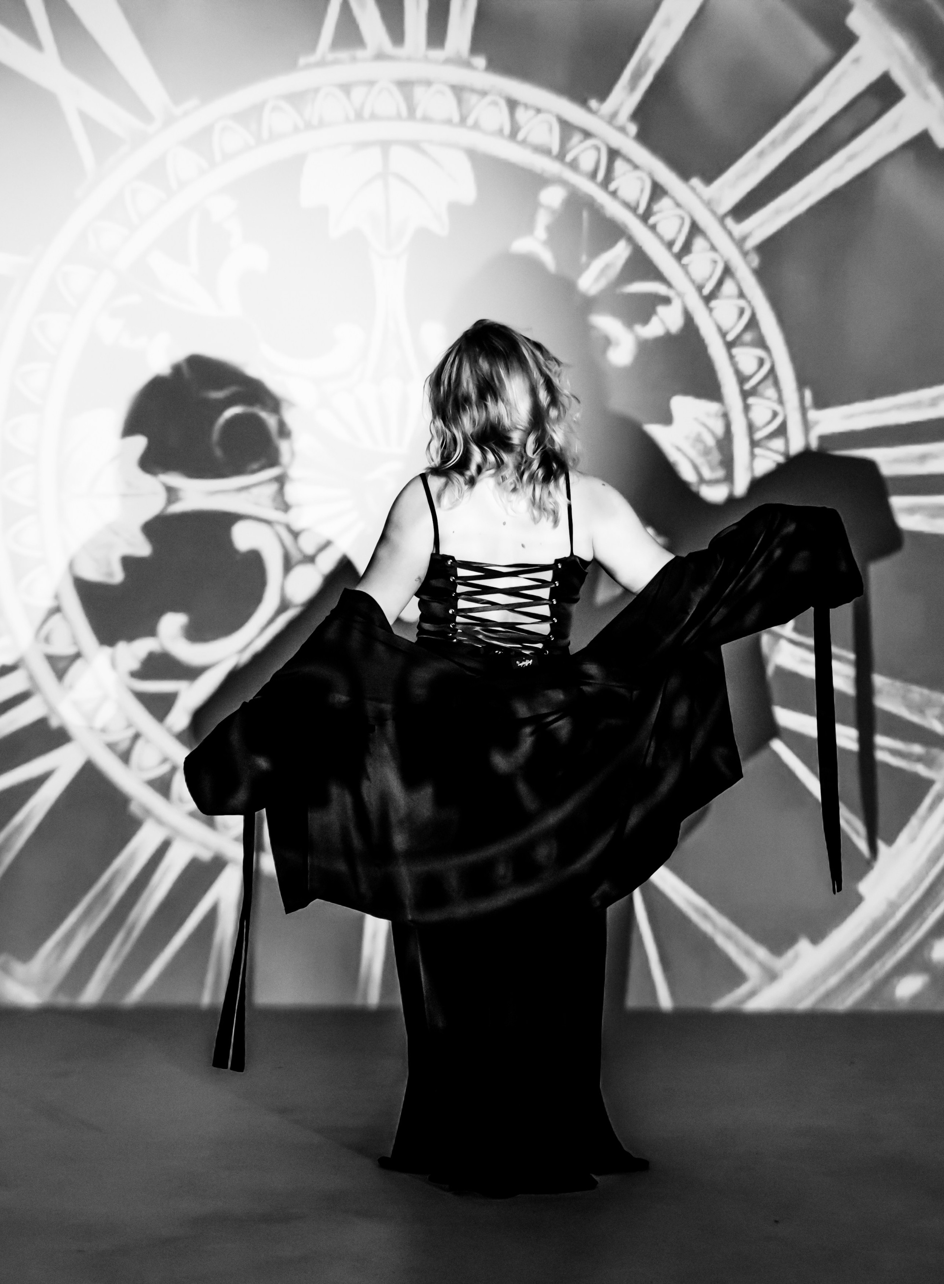 В этой съёмке мы соединили кинематографичный свет, движение ткани и проекцию часов, чтобы подчеркнуть характер героини: мягкой, сильной, живой.