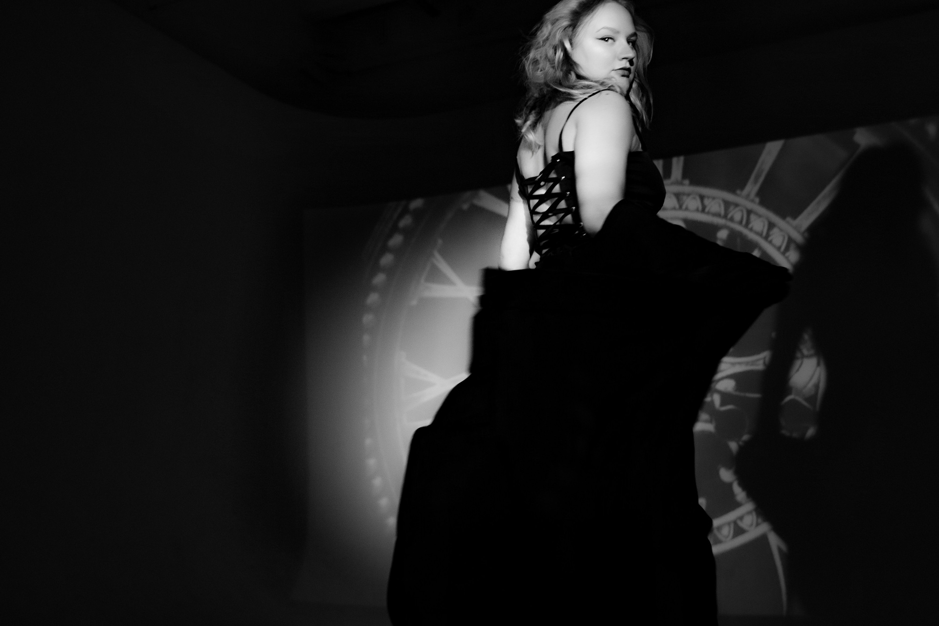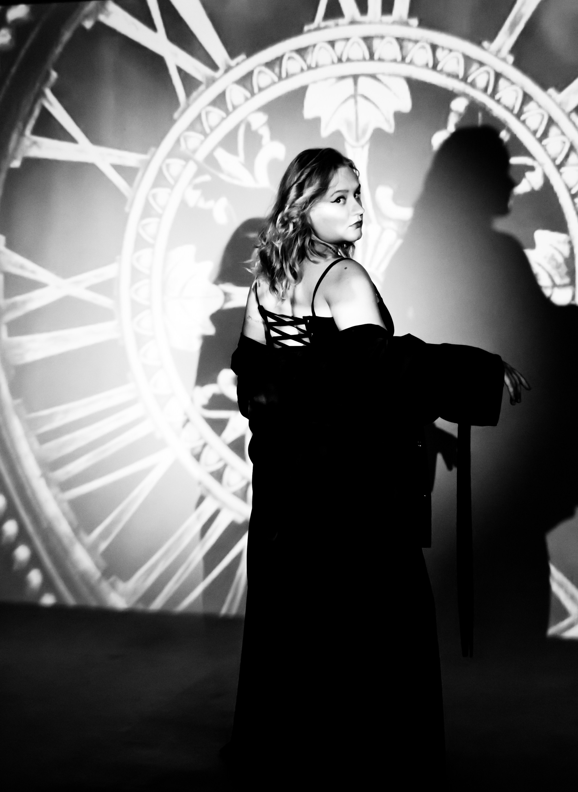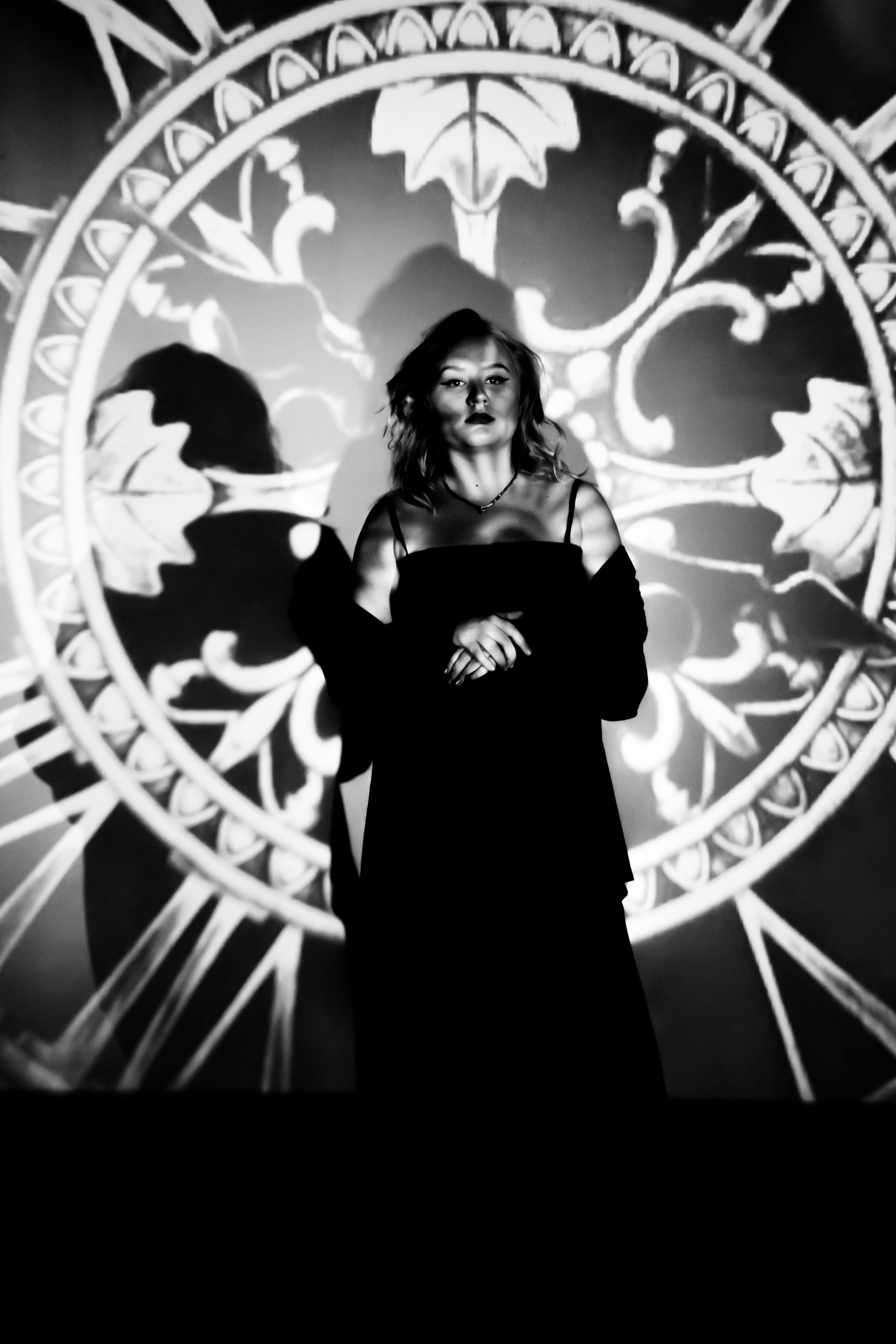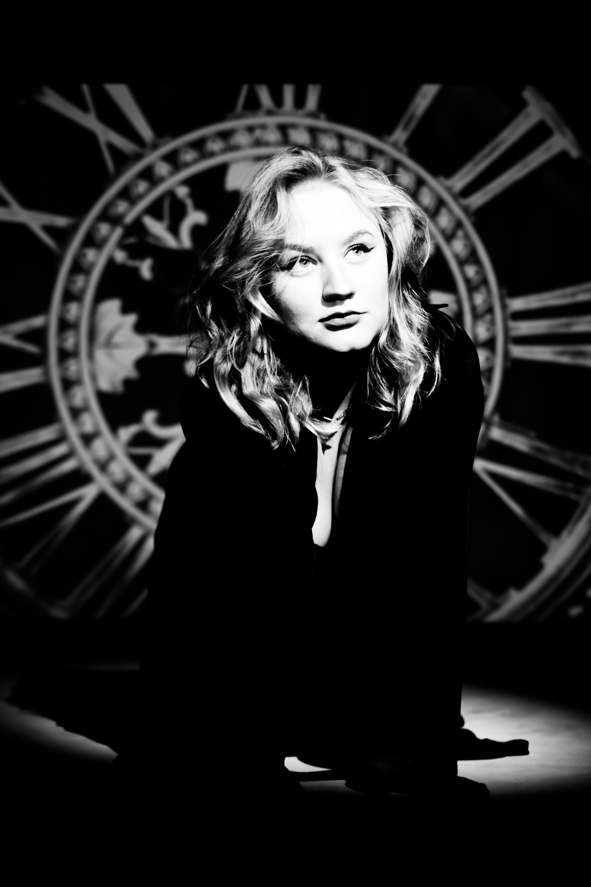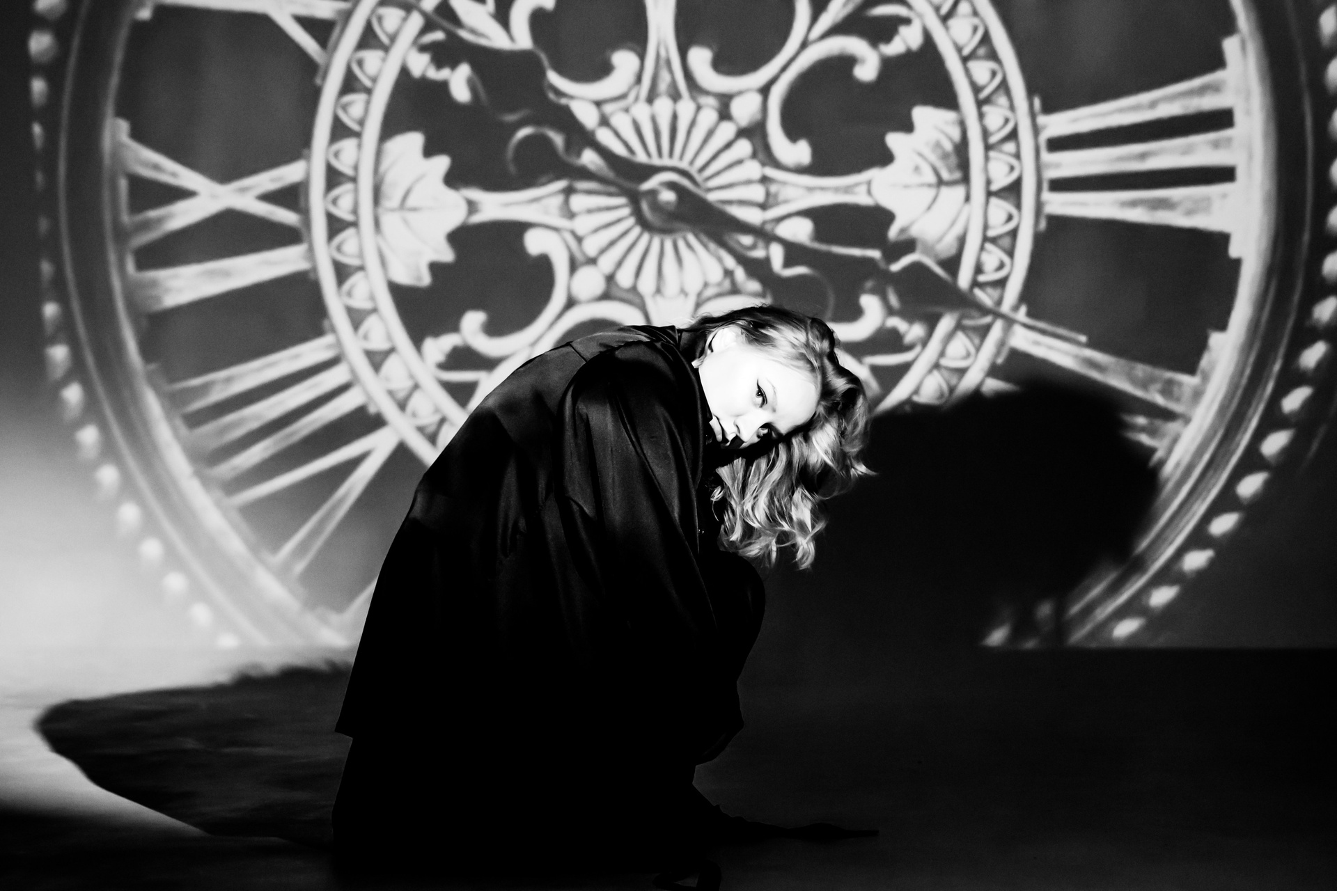 Про то, как меняются роли, города, обстоятельства, а внутренний стержень остаётся. Чёрное платье, тени, циферблат на фоне не просто декорация, а визуальный образ «часов», которые мы так часто боимся и к которым всё время оглядываемся.