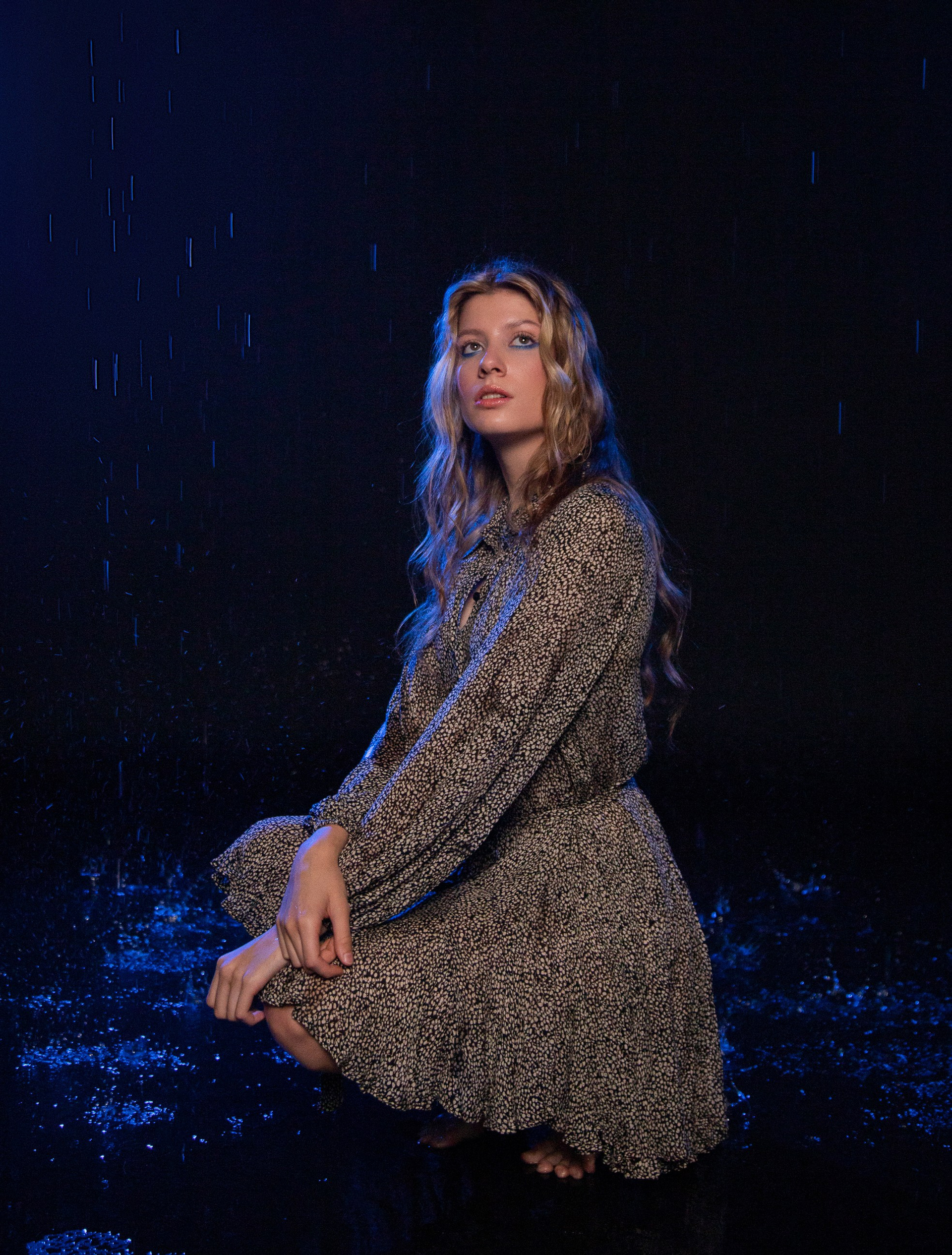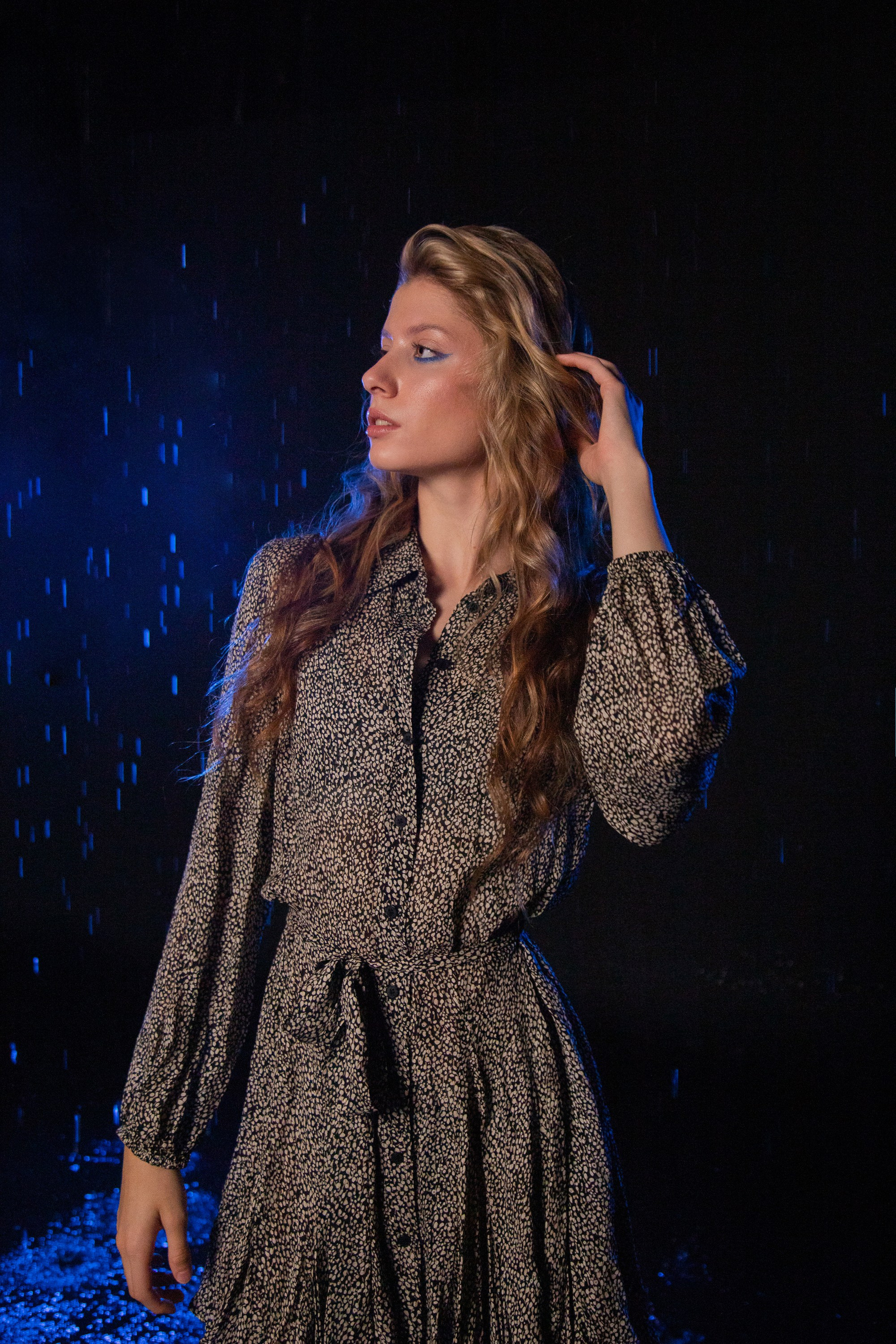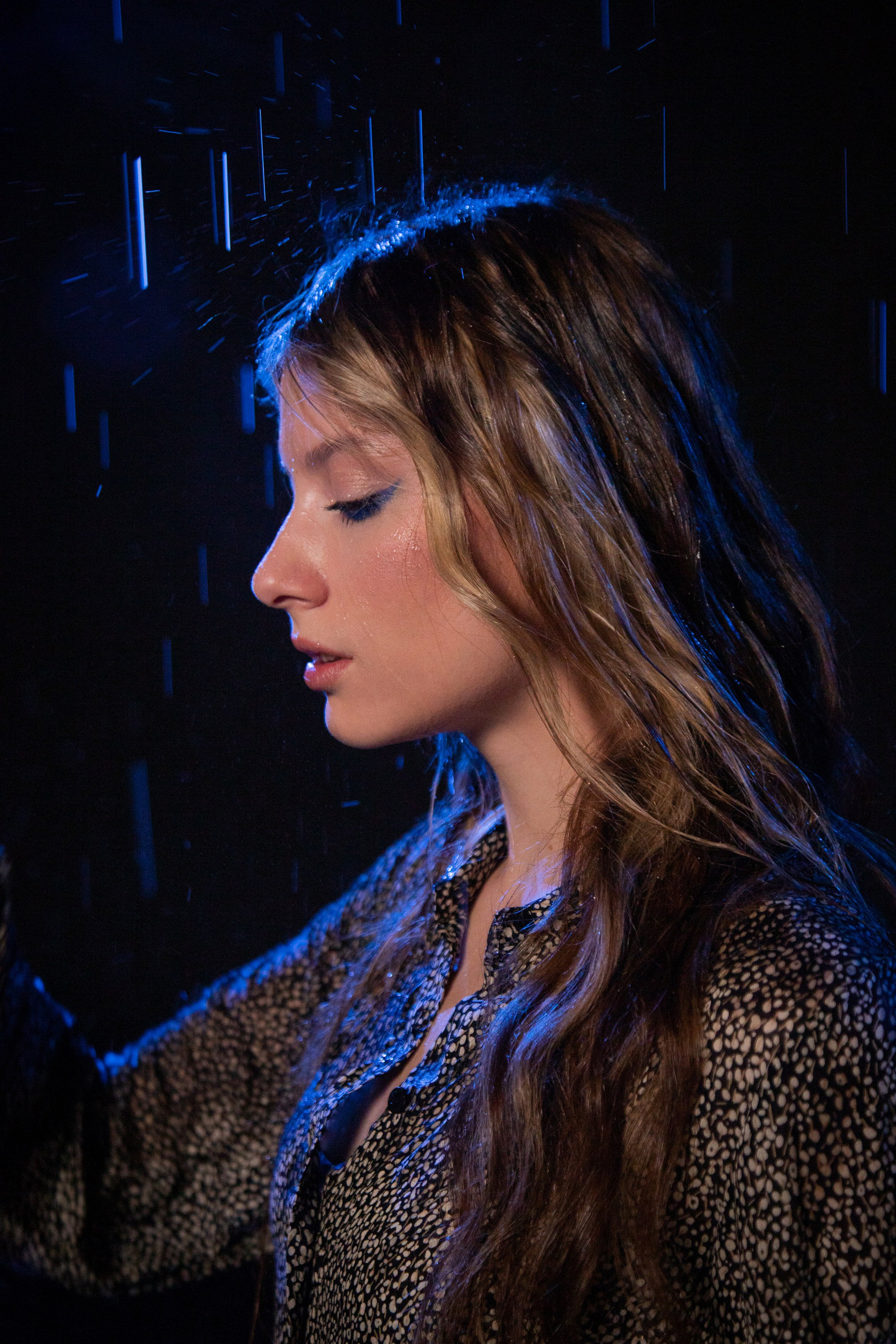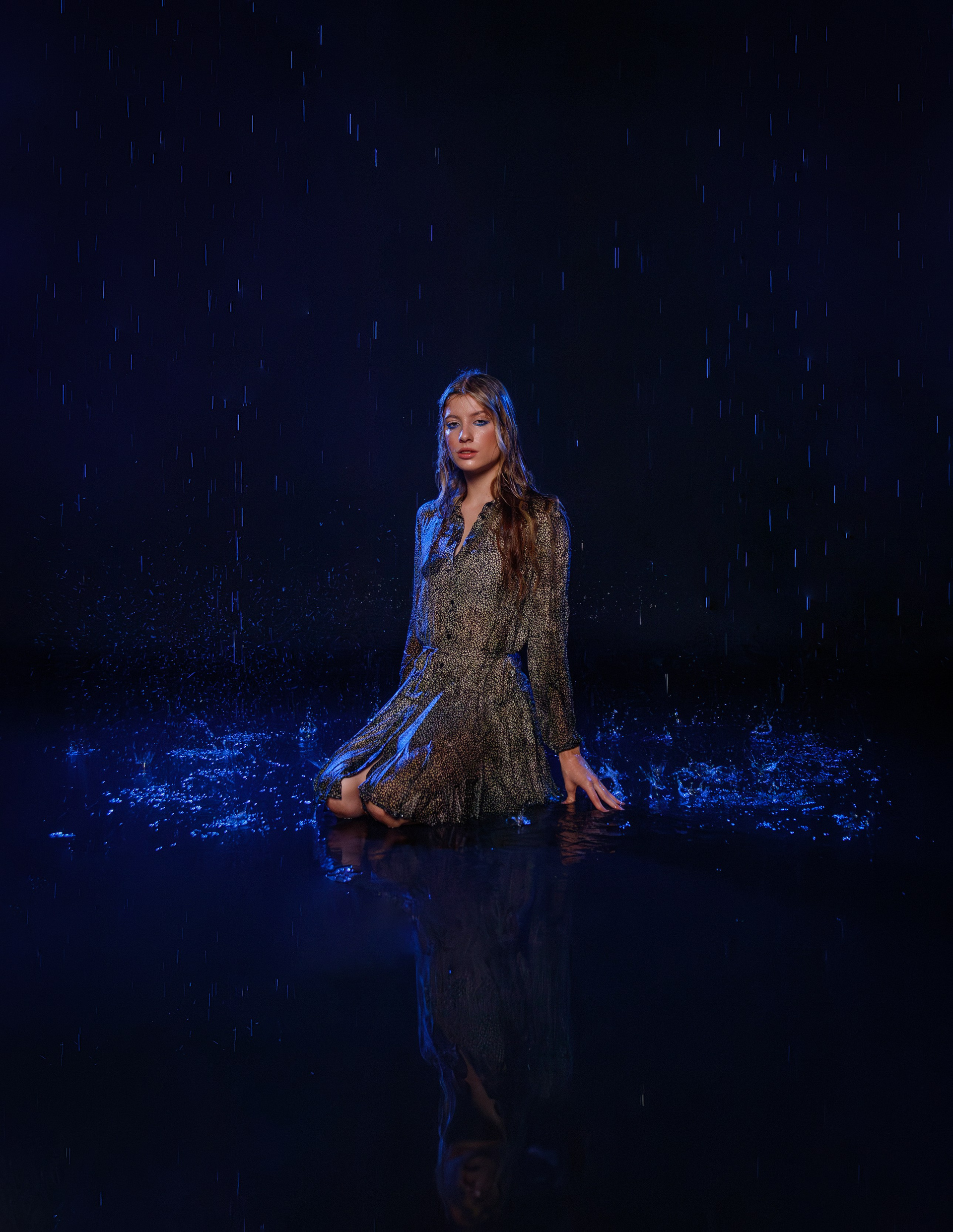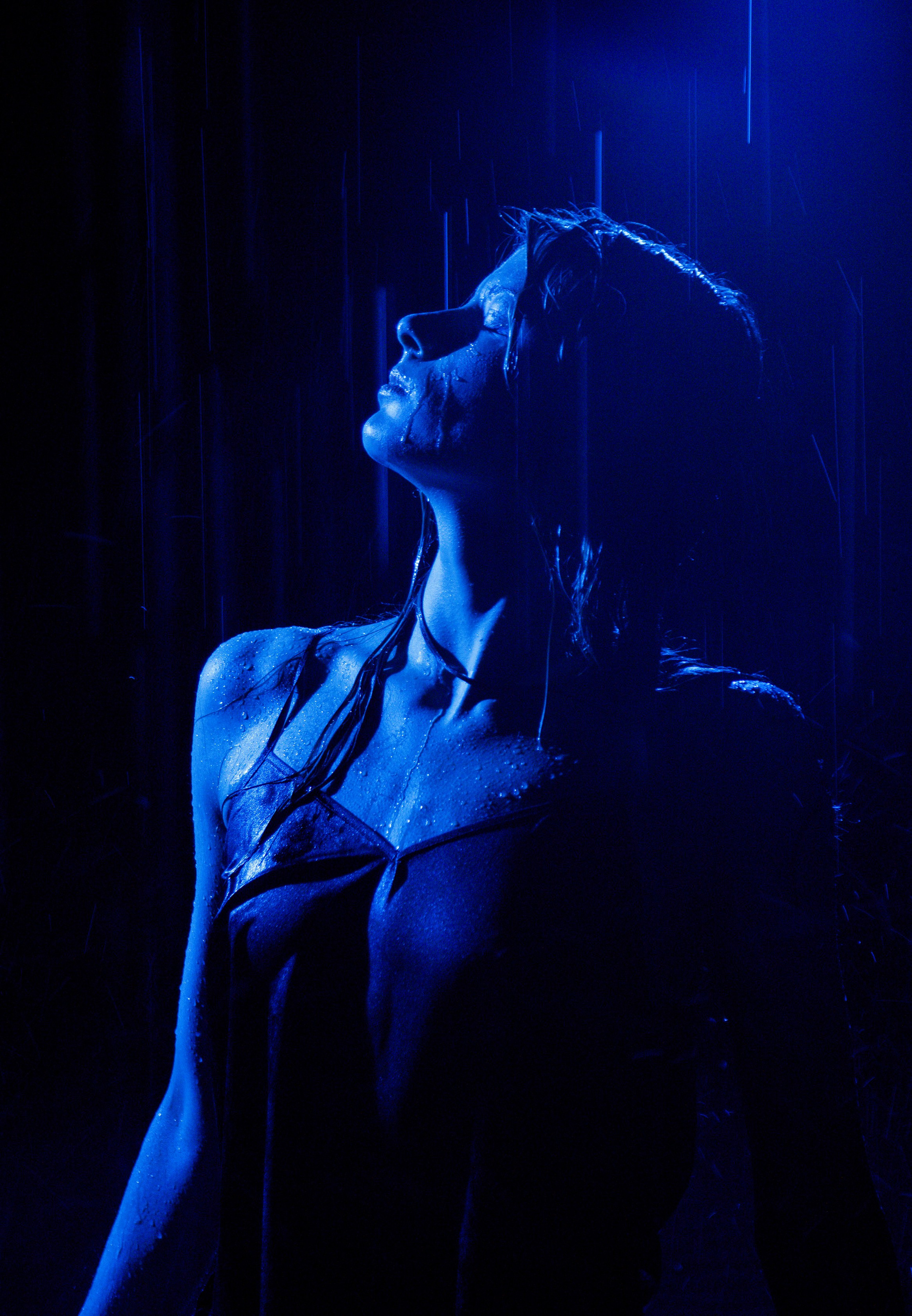 Серия «Внутри дождя», история о тишине, которая наступает, когда мир снаружи шумит. Холодный синий свет, мокрые волосы, мерцающие капли и спокойный взгляд героини создают ощущение внутренней силы и принятия.